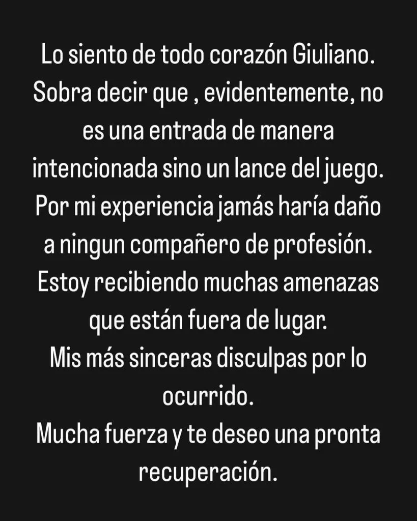 Tras el partido, Matos publicó un pedido de disculpas por la patada sobre la banda derecha que provocó la fractura del Cholito. Además, destacó que está recibiendo amenazas por la desafortunada acción.