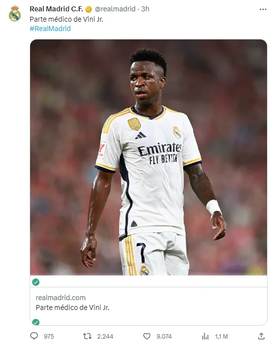 Este lunes, la Casa Blanca emitió el parte médico del atacante. “Tras las pruebas realizadas a nuestro jugador Vini Jr. por los Servicios Médicos del Real Madrid se le ha diagnosticado una lesión en el músculo bíceps femoral derecho. Pendiente de evolución“.
