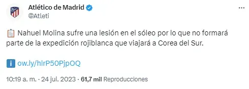 A solo 3 días de su pimer partido, los colchoneros anunciaron su primera baja. “Nahuel Molina finalizó el pasado viernes el entrenamiento con molestias. Tras haberse sometido a diferentes pruebas médicas se ha confirmado que sufre una lesión en el sóleo“.