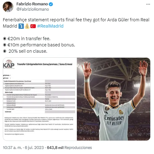 Previo al anuncio oficial, Fenerbahçe hizo el reporte del traspaso. El periodista, Fabrizio Romano compartió el informe en el que se anuncia que Real Madrid pagó 20 millones de euros por su liberación.