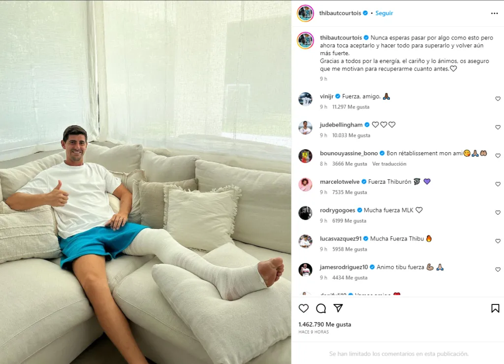 Desde su casa y con la pierna vendada a la espera de la cirugía, Courtois compartió un mensaje a los fanáticos: “Nunca esperas pasar por algo como esto, pero ahora toca aceptarlo y hacer todo para superarlo y volver aún más fuerte. Gracias a todos por la energía, el cariño y los ánimos, os aseguro que me motivan para recuperarme cuanto antes“.