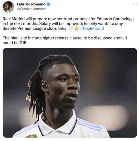 ”El Real Madrid preparará una nueva propuesta de contrato para Eduardo Camavinga en los próximos meses. Se mejorará el salario; solo quiere quedarse a pesar de los vínculos con los clubes de la Premier League. El plan es incluir una cláusula de rescisión más alta, que se discutirá pronto; podría ser de € 1B”, destaca el comunicador en su publicación.