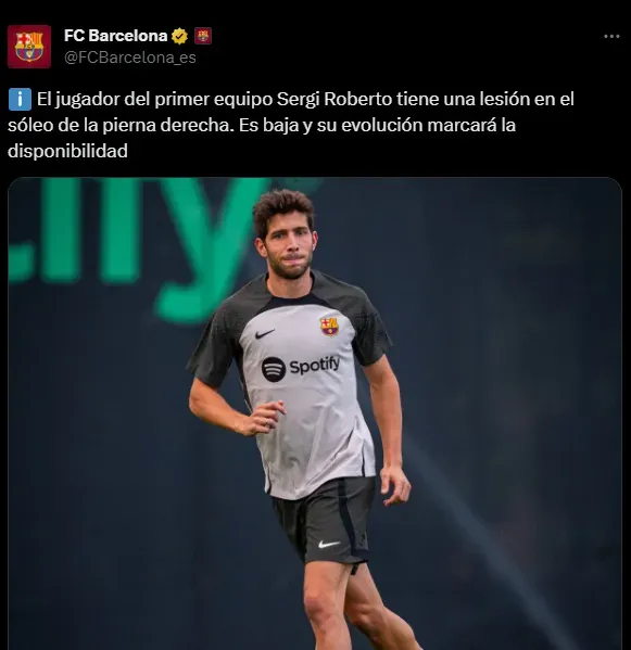 Para este enorme compromiso, Xavi Hernández, entrenador del Barsa, sufrirá la baja de uno de los capitanes del Culé: Sergi Roberto, nada más y nada menos. El club informó que sufrió una lesión en el sóleo de la pierna derecha y se perderá, de mínimo, los encuentros ante Athletic Bilbao, el Shakhtar y Real Madrid.