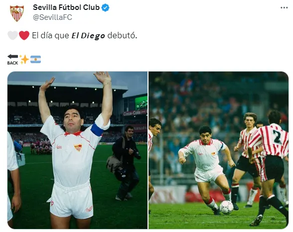 ”El día que el Diego debutó”, fue la frase con la que el conjunto blanquirrojo tituló su publicación en sus cuentas de redes sociales, con dos imágenes del astro argentino en el campo de juego del estadio de San Mamés, una saludando en la previa del cotejo y la otra disputando el duelo que terminó perdiendo 2 a 1 frente al Athletic Club.