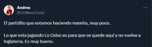 Tan buen primer tiempo hizo Gio que hasta algunos hinchas de Villarreal se lamentan de no tenerlo para esta temporada. Cabe recordar que el Submarino Amarillo fue su último equipo, pero no volvieron a pedir su fichaje o una nueva cesión.