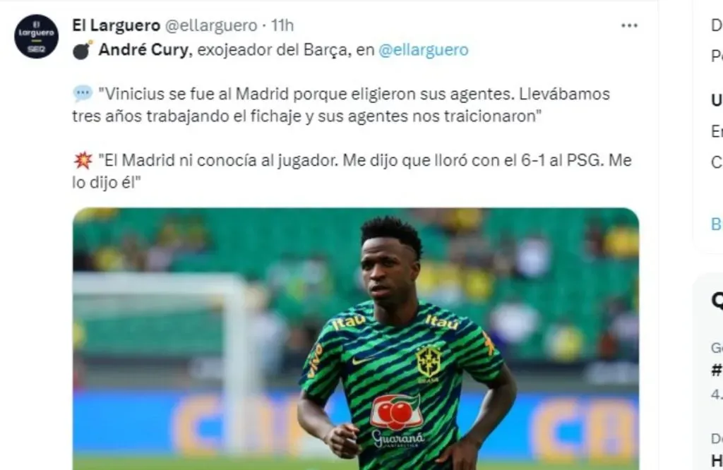 “Lo de Vinicius estaba todo arreglado y el Madrid se enteró de que estaba en Barcelona y le invitaron a ir a Madrid, pero en el Madrid ni le conocían. Vinicius se fue al Madrid porque eligieron sus agentes”, finaliza un André Cury que en la Cadena SER vuelve a referirse a una de las grandes disputas que han tenido Merengues y Culés en el mercado desde la saga Neymar.