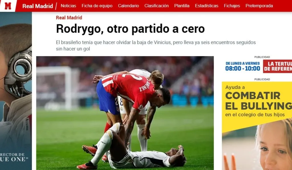 “El brasileño tenía que hacer olvidar la baja de Vinicius, pero lleva ya seis encuentros seguidos sin hacer un gol”, dicta MARCA para referirse a la única referencia ofensiva de Ancelotti en el derbi y como no pudo dar el paso al frente que esperaba el club mientras Vinicius se recuperaba. Queda ver como mueve las fichas Ancelotti, pero por Real Madrid consideran que el retorno del ‘7’ quitará presión a un Rodrygo Goes que quedó en deuda en estas semanas. MARCA no duda.
