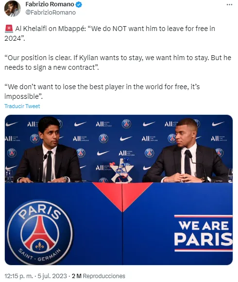 “Nuestra posición es muy clara. Si Mbappé quiere quedarse, nosotros queremos que se quede, pero debe firmar un nuevo contrato. No podemos permitir que se vaya gratis. Él no está pensando en marcharse gratis. Si alguien ha cambiado su cabeza, no es nuestra culpa” añadió.