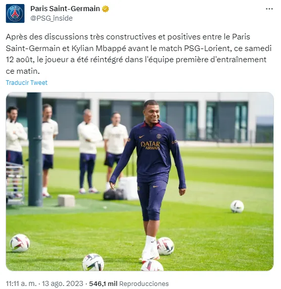 Luego de que surgieran los rumores, el club salió a confirmar todo. “Tras discusiones muy constructivas y positivas entre el Paris Saint-Germain y Kylian Mbappé antes del partido PSG-Lorient del sábado 12 de agosto, el jugador ha sido reincorporado al primer equipo de entrenamiento esta mañana“.