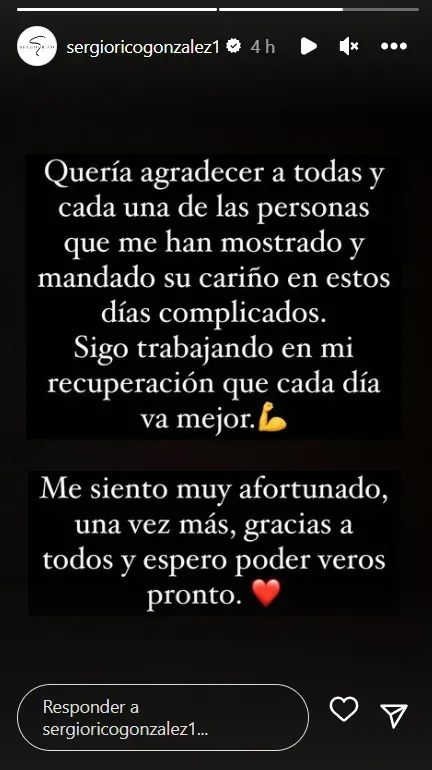 “Quería agradecer a todas y cada una de las personas que me han mostrado y mandado su cariño en estos días complicados. Sigo trabajando en mi recuperación que cada día va mejor. Me siento muy afortunado, una vez más, gracias a todos y espero veros pronto” dijo por medio de su cuenta en Instagram.