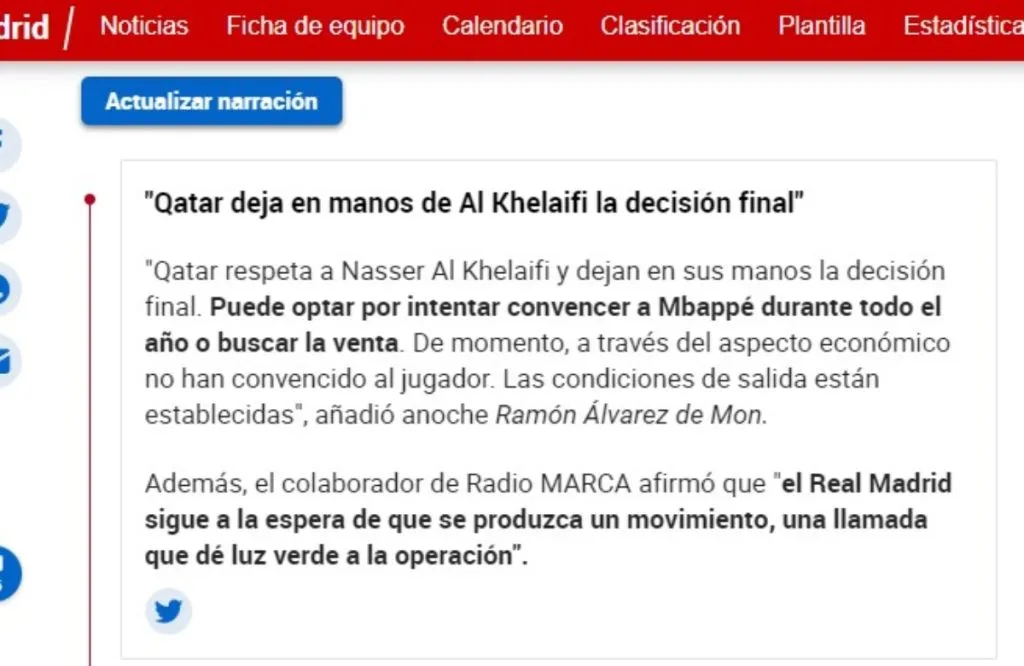 “Qatar respeta a Nasser Al-Khelaifi y dejan en sus manos la decisión final. Puede optar por intentar convencer a Mbappé durante todo el año o buscar la venta. De momento, a través del aspecto económico no han convencido al jugador. Las condiciones de salida están establecidas”, desvela el periodista de MARCA sobre la postura de Doha alrededor del tema.