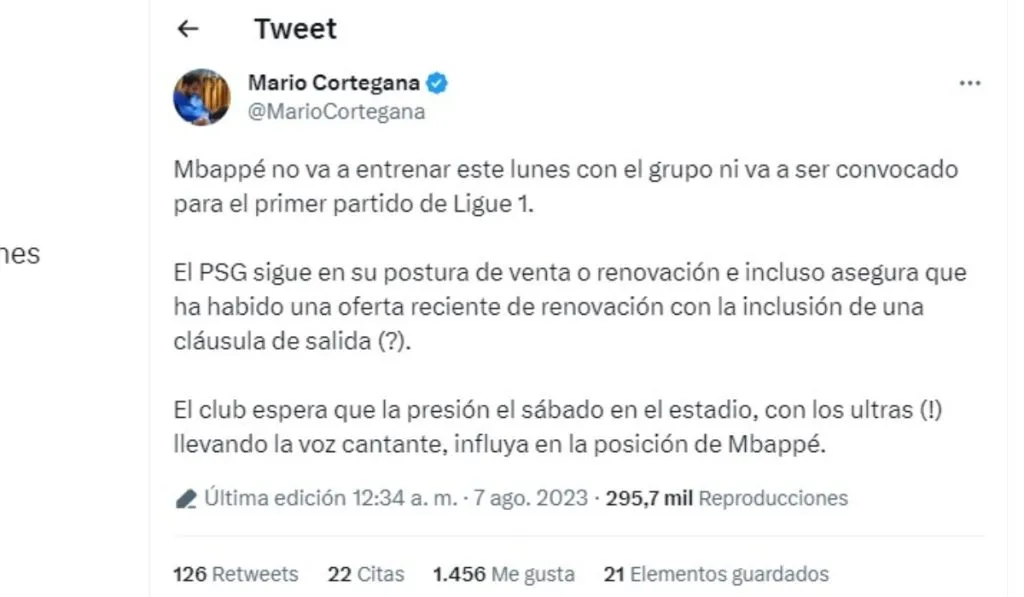 “Mbappé no va a entrenar este lunes con el grupo ni va a ser convocado para el primer partido de Ligue 1”, confirma Mario Cortegana desde The Athletic en relación con ese duelo ante Lorient que abre la primera división gala para PSG. Kylian será descartado por Luis Enrique y un Nasser Al-Khelaifi que habría incluido en la última propuesta de renovación una opción para que el jugador deje el club por el 2024 con una transferencia. Fabrizio Romano ya confirmaba que el ariete ha rechazado dicha opción de cara al futuro.