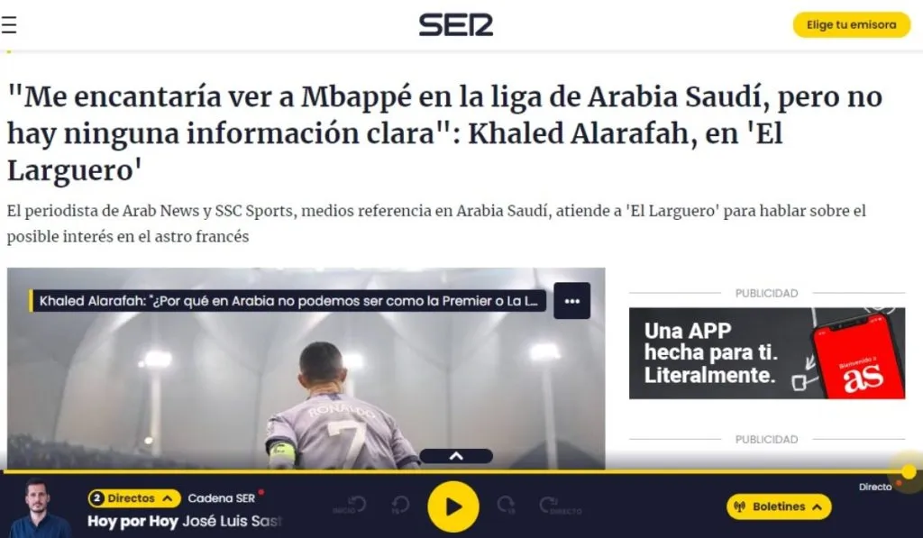 ¿Y que dicen por Riad alrededor de un fichaje que cambiaría el fútbol en todos los sentidos? Pues hay novedades y estas sorprenderán a más de uno. Khaled Alarafah, periodista de Arab News y SSC Sports, charlaba anoche con Cadena SER para dejar en claro que por Oriente Medio nada es oficial todavía. Hay interés, más no propuestas formales.