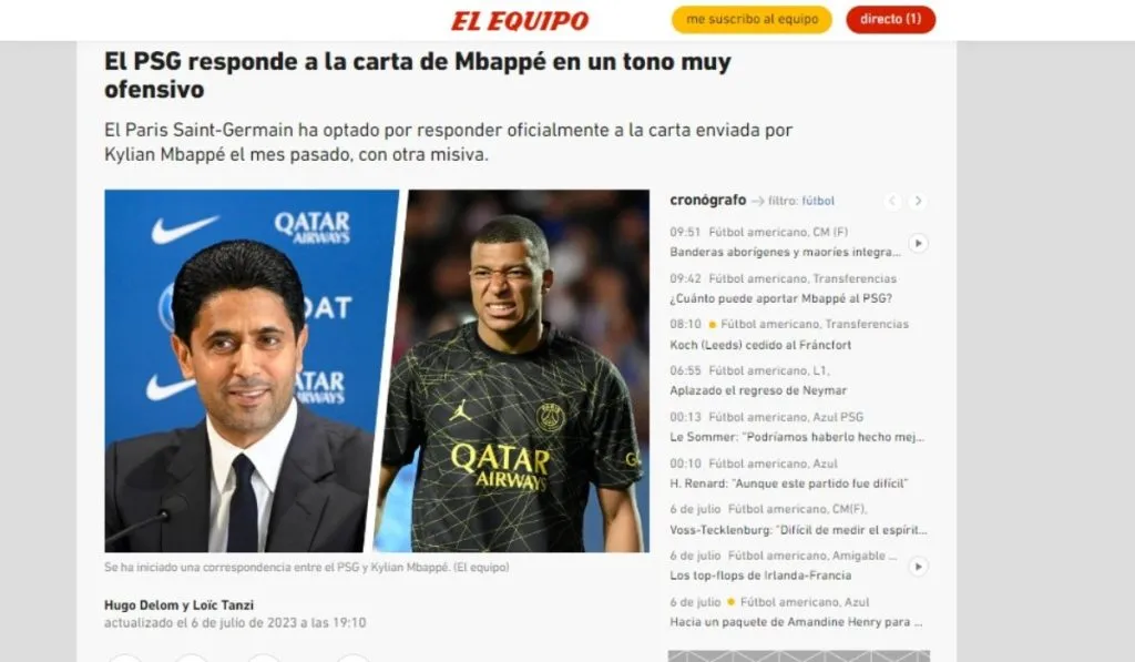 L’Equipe abre la caja de pandora y desvela las claves para entender esta guerra PSG–Kylian Mbappé que tiene el mercado de fichajes patas arriba. El principal medio deportivo de Francia filtra algunos de los extractos de las cartas de Nasser Al-Khelaifi al máximo objetivo de Real Madrid. Se habla de falta de sinceridad y de un daño enorme al club Parque de Los Príncipes.