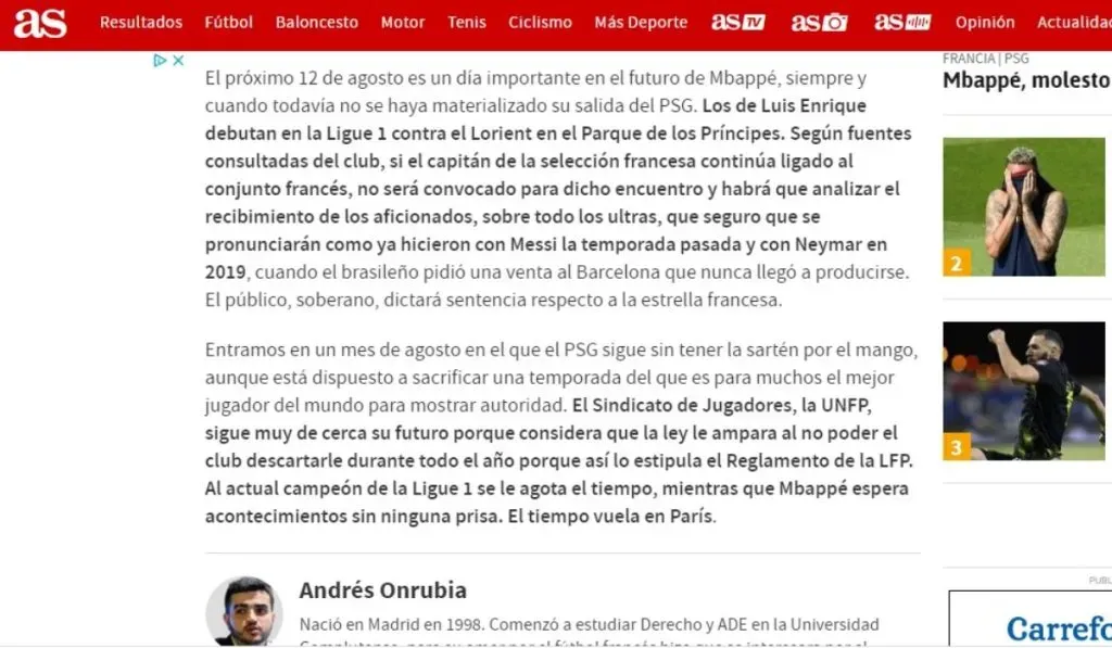 Correcto, Mbappé no jugará salvo sorpresa en el parque de Los Príncipes cuando PSG inicie la defensa del título ante Lorient. La postura de los ultras es el siguiente gran tema de conversación, así como los montos que tarde o temprano L’Equipe espera por parte de Real Madrid. Se habla de ofertas más que bajas de la casa blanca.