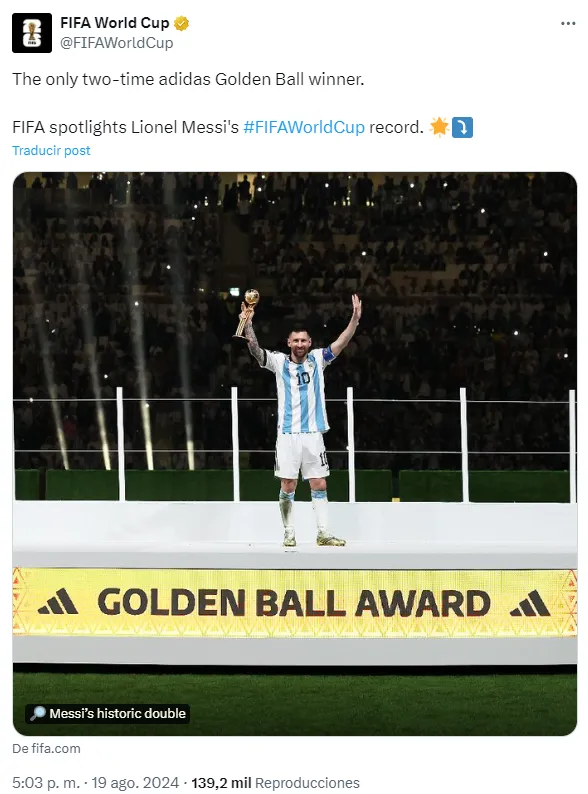 Se trata del Balón de Oro del certamen (que se entrega al mejor futbolista desde España 1982), premio que Leo se adjudicó en dos ocasiones, siendo así, el máximo ganador de este galardón. Lo obtuvo en Brasil 2014 así como también en Qatar 2022, edición en la que, por supuesto, lo recibió con otra impronta, al haberlo complementado con el trofeo de campeón.