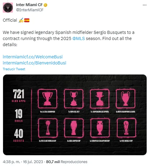 “Inter Miami CF anunció hoy que ha fichado al legendario mediocampista español Sergio Busquets con un contrato hasta el final de la temporada 2025 de la Major League Soccer (MLS)” dice el comunicado el equipo norteamericano.