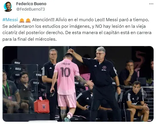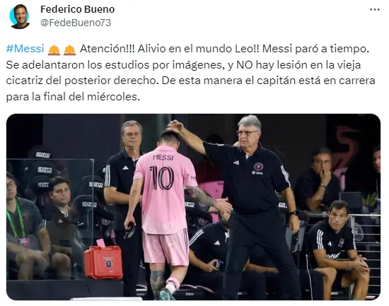 “Atención: ¡Alivio en el mundo Leo! Messi paró a tiempo. Se adelantaron los estudios por imágenes, y NO hay lesión en la vieja cicatriz del posterior derecho. De esta manera el capitán está en carrera para la final del miércoles“, confirmó Bueno.