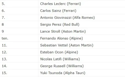 Pero la batalla por ser la tercera escudería con más puntos va a volver a decir presente, ya que las Ferrari deCharles LeclercyCarlos Sainzcomenzarán en la quinta y sexta posición respectivamente. Otra vezAntonio Giovinazziestampó al Alfa Romeo en el séptimo lugar, por lo que por segundo fin de semana consecutivo intentará sumar unidades.Checovolverá a tener trabajo partiendo desde la octava plaza sabiendo que atrás estaráLance Stroll, el hombre de Aston Martin que le propinó una linda batalla en la sprint.