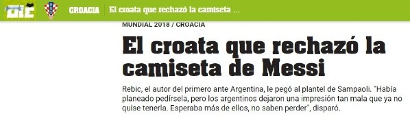 El jugador croata no se fue conforme con la forma de ser de sus rivales y dio vuelta atrás con su cometido: “Antes del partido había planeado conseguir la camiseta de Messipara un buen amigo que lo admira mucho. Pero los argentinos dejaron una impresión tan malaque ya no quise tenerla”, expresó.