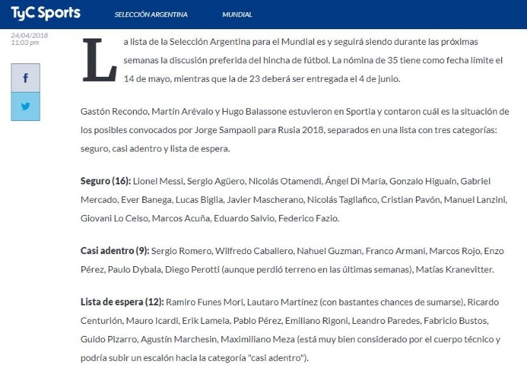 Con igual cantidad de dudas y certezas, el entrenador de La Albiceleste prepara su lista para viajar a Rusia. Por el momento, el DT tiene entre sus planes a30futbolistas que se encuentran jugando al fútbol de manerainternacional y otros siete que están en diversos equipos de Argentina, jugando la liga local.
