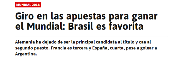 Giro en las casas de apuestas: Brasil, pentacampeonadel mundo, le arrebató el primer puesto a Alemania en diferentes sitios y se convirtió en el nuevo favorito a llevarse la Copa en Rusia.