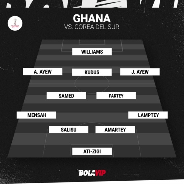 Ghana saltará a la cancha con Lawrence AtiZigi; TariqLamptey, Daniel Amartey, MohammedSalisu, JonathanMensah; Thomas Partey, Abduel Samed;Jordan Ayew, Mohammed KudusAndre Ayew;Iñaki Williams.