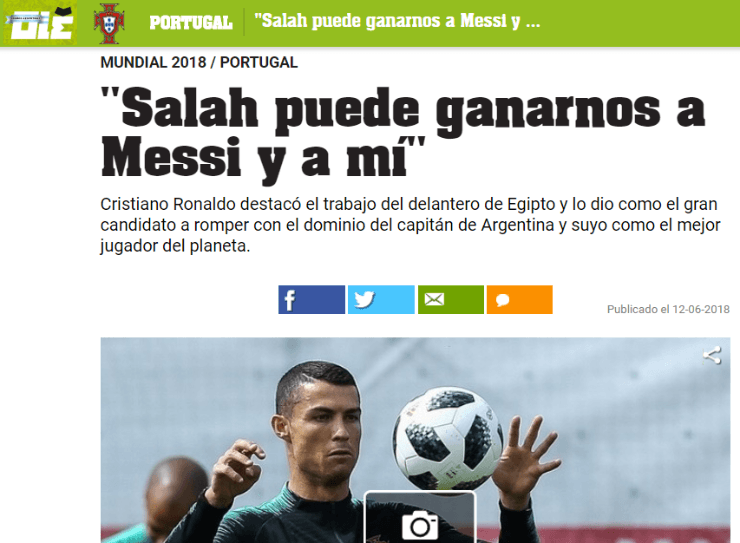 Según detalló el Diario Olé, el hombre de Portugal dejó de lado por un momento las rutinarias comparaciones con el astro Argentino Lionel Messi:“Todos hablan de la batalla de Cristiano Ronaldo y Messi, pero hay otros jugadores que pueden ganar el Balón de Oro”. “Salah es uno de los que pueden pelear mano a mano con nosotros para quedarse con el premio”, agregó metiendo en la disputa de los mejores jugadores al deportista de Egipto.