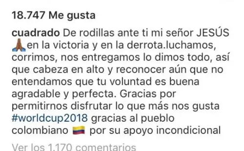“Gracias al pueblo colombiano por su apoyo incondicional”, reza la foto de Cuadrado, junto a una imagen de él arrodillado, destacando a Dios.