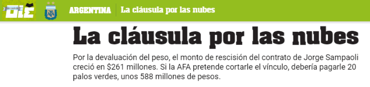 Según detalló Olé, a causa de la devaluación del peso argentino, fueron $261 millones lo que aumentó el monto para rescindirle el contrato al DT de La Albiceleste. En consecuencia, dado esto, la AFA deberá abonarle cerca de 20 millones de dólares (588 millones de pesos argentinos).