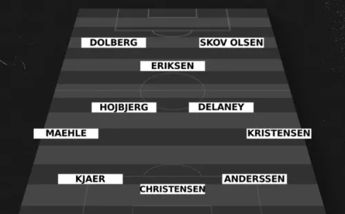 Dinamarca sale con:Kasper Schmeichel;Rasmus Kristensen, Joachim Andersen, Andreas Christensen, Simon Kjaer, Joakim Maehle;Thomas Delaney, Pierre-Emile Højbjerg, Christian Eriksen;Andreas Skov Olsen yKasper Dolberg.