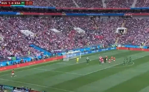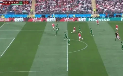 La jugada transcurrió cerca del minuto 15. Rusia había hilvanado una buena jugada grupal, la cual casi llega a buen destino. El balón terminó saliendo por la línea final y el árbitro argentino que, luego de atender a dos jugadores que habían quedado sentidos, se debía ejecutar un córner.
