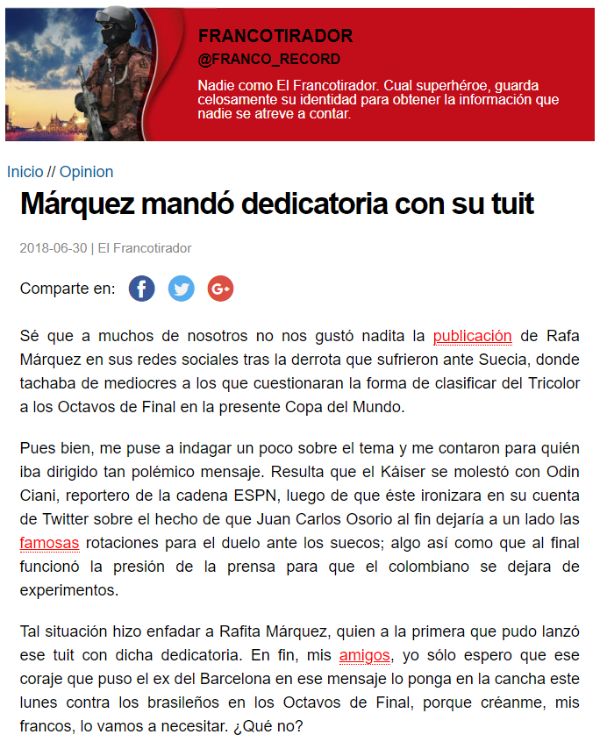 “Pues bien, me puse a indagar un poco sobre el tema y me contaron para quién iba dirigido tan polémico mensaje. Resulta que el Káiser se molestó con Odin Ciani, reportero de la cadena ESPN, luego de que éste ironizara en su cuenta de Twitter sobre el hecho de que Juan Carlos Osorio al fin dejaría a un lado las famosas rotaciones para el duelo ante los suecos; algo así como que al final funcionó la presión de la prensa para que el colombiano se dejara de experimentos”, reveló el columnista.