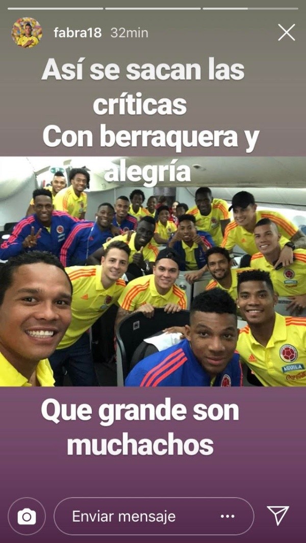 Apenas convirtió el gol Yerry Mina, Fabra no dudó en tomar una foto y subirla a su Instagram junto a la frase “golazo” en apoyo a su compatriota. Aunque el lateral izquierdo siempre destaca que son una “gran familia” y que se siente parte, hace pocos días escribió cuán lamentado está por haberse quedado afuera de Rusia 2018.