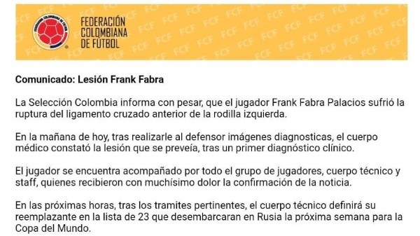 Segundo día seguido con noticias durísimas para arrancar el día. Ayer fue Manuel Lanzini con la Selección Argentina, hoy Frank Fabra con la Selección Colombia.