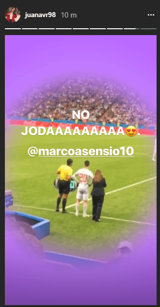 En una historia de Instagram, Juana Valentina reveló estar en cancha en el encuentro entre España e Irán, y se tomó el tiempo de fotografiar a Marco Asensio cuando estaba por ingresar al campo de juego.
