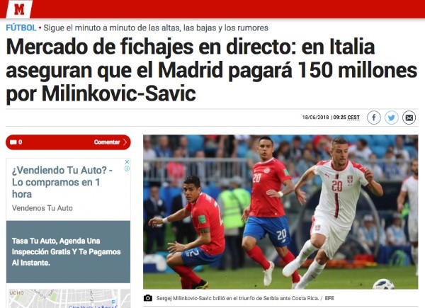 Esta vez, la Casa Blanca habría puesto sus ojos en la figura del partido entre Serbia y Costa Rica, Milinkovic-Savic, quien actualmente juega en Lazio y es pretendido por la Juventus de Turín. En Madrid aseguran que la oferta sería de 150 millones de euros.