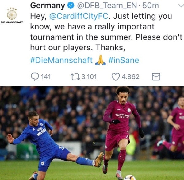 “CardiffCity, sólo para que sepan; tenemos un torneo realmente importante en el verano. Por favor, no lastimes a nuestros jugadores. Gracias” escribió la cuenta oficial de Alemania, en referencia al Mundial de Rusia 2018.
