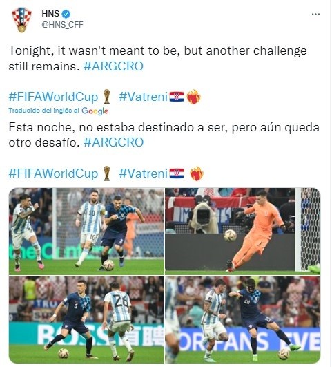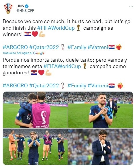 Incluso dentro de sus mensajes también postearon que pasarán la página de la derrota ante los argentinos y que enfocará sus miras en el partido del tercer puesto, que se disputará el próximo sábado 17 de diciembre ante el perdedor del duelo entre Francia y Marruecos: “esta noche, no estaba destinado a ser, pero aún queda otro desafío”.