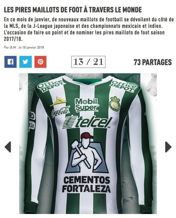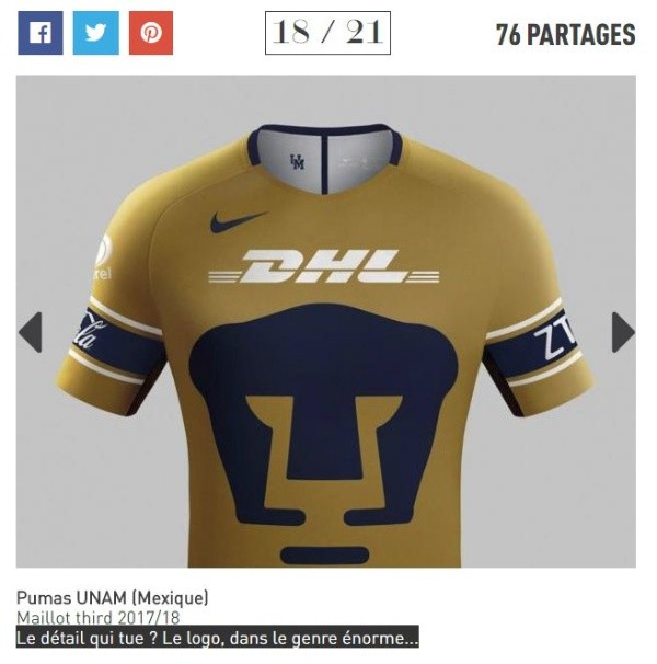 En el rankingfiguran dos equipos mexicanos, Pumas y León. Hasta una camiseta suplente del Arsenal de color celeste, en contra de su clásica camiseta roja con mangas blancas.