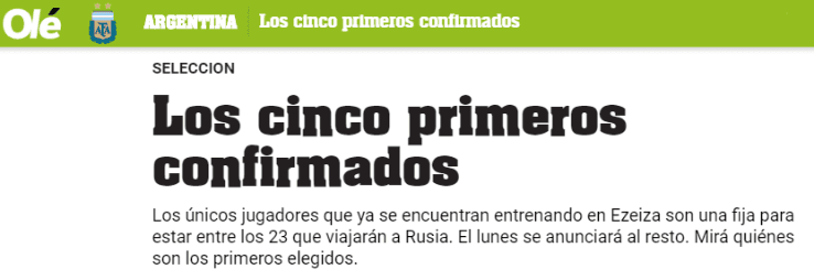 Sin embargo, según confirmó el Diario Olé, teniendo en cuenta que la lista presentada por Sampaoli es la preliminar (deberá dejar 12 deportistasafuera),éstos cinco jugadores ya tendrían el lugar asegurado en el avión que viajará a Rusia 2018.