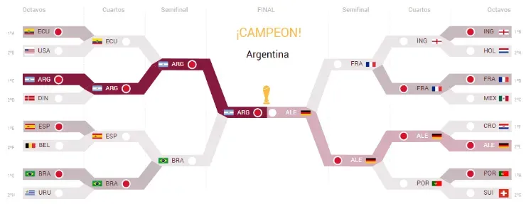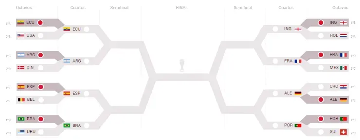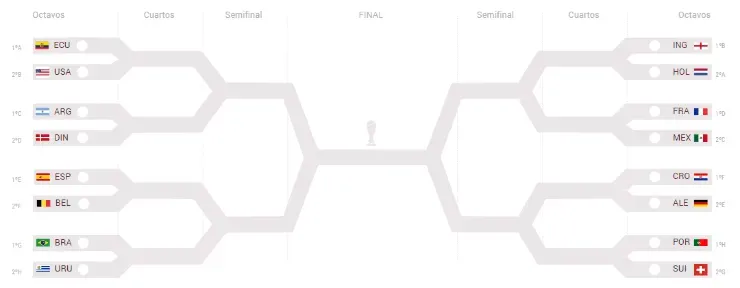 3) Una vez completadas todos todos los grupos, se desplegará un menú debajo, con la conformación de las llaves de Octavos de Final según tus pronósticos. Continuando con el modelo de ejemplo: