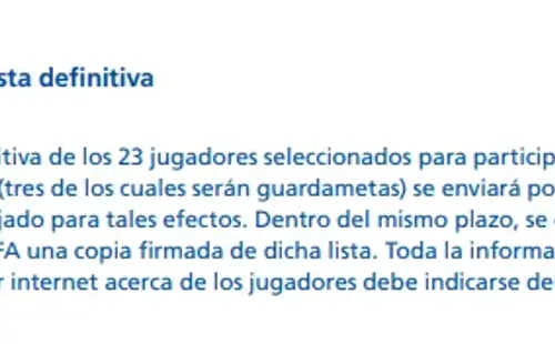 Según el reglamento de FIFA, semanas antes del inicio del torneo, cada equipo deberá enviasr un listado provisional con 35 futbolistas para luego acortarlo a uno definitivo de 23 jugadores.