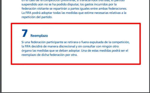 “Si una federación participante se retirara o fuera expulsada de la competición, la FIFA decidirá de manera discrecional y sin consultar con ningún otro órgano las medidas que se deban adoptar. Una de estas medidas podrá ser el reemplazo de dicha federación por otra”, explica en su artículo.