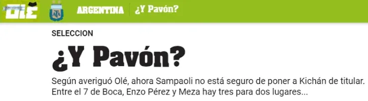 Según informó Olé, el entrenador de la Selección Argentina habría dado marcha atrás en su decisión sobre la titularidad de Cristian Pavón. El medio argentino explicó que, luego de haberlo posicionado en el once titular, el DT ahora estaría evaluando la posibilidad de poner en ese lugar a Maximiliano Meza.
