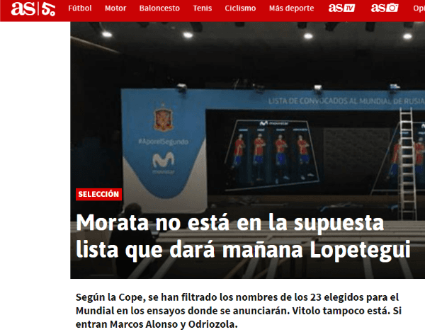 Los 23 elegidos serían:De Gea, Kepa, Reina; Carvajal, Odriozola, Piqué, Sergio Ramos, Nacho, Azpilicueta, Jordi Alba, Marcos Alonso;Busquets, Saúl, Iniesta, Thiago, Koke, Isco; Silva, Asensio, Lucas Vázquez, Diego Costa, Rodrigo,Aspas.
