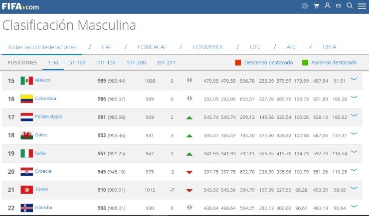 Aclarando que el ranking fue actualizado por última vez en 07 de junio de 2018 (antes que comience el Mundial), Croacia, desde ese entonces, ocupa la posición número 20. Lo curioso es que selecciones como Italia, Gales yHolanda, las cuales no clasificaron a al certamen disputado en Rusia, se encuentran por encima del combinado europeo.