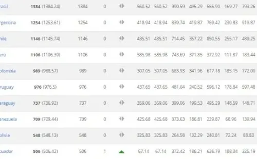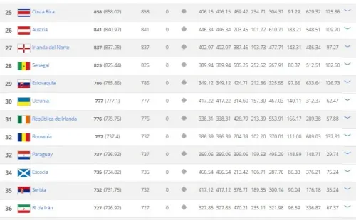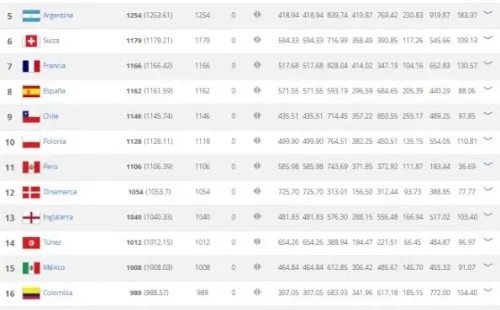 Argentina (5°) y Chile (9°), que no tendrá Mundial, son las otras dos selecciones latinoamericanas que completan el top ten. Un poco más abajo, pero con buena clasificación, se ubican Perú (11°), México (15°), Colombia (16°) y Uruguay (17°).