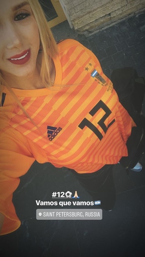 Daniela Rendón llegó hasta el estadio del Zenit de San Petesburgopara alentar a la Selección Argentina y especialmente a su esposo Franco Armani, que en el duelo definitorio ante Nigeria jugará su primer partido con La Albiceleste.