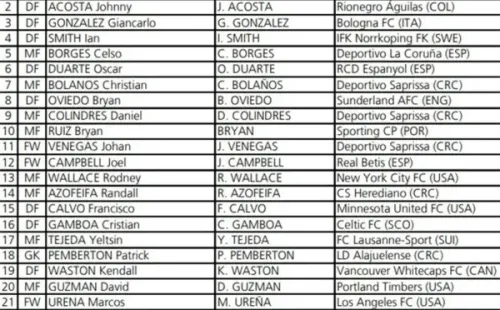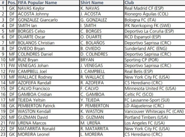 El seleccionado costarricense ya conoce de manera oficial los dorsales que utilizará en el Mundial de Rusia. Keylor Navas abre la lista con el número uno, mientras que el también portero Leonel Moreira cierra con el 23.